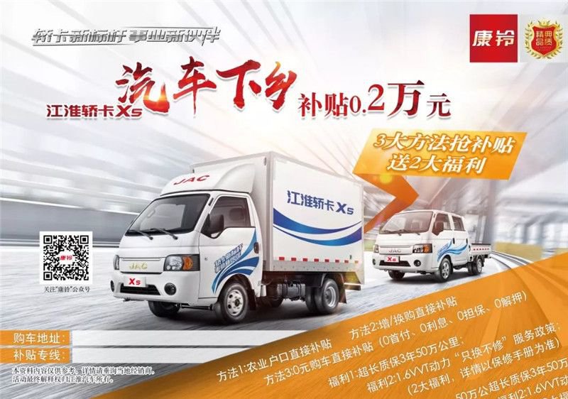 同时,针对报废补贴,推出增/换购方案,不限货车类型(轻卡、微卡、三轮车、农用车均可)、不限货车品牌,只要原车主增/换购江淮轿卡X5,均可享受0.2万元/台的现金补贴。