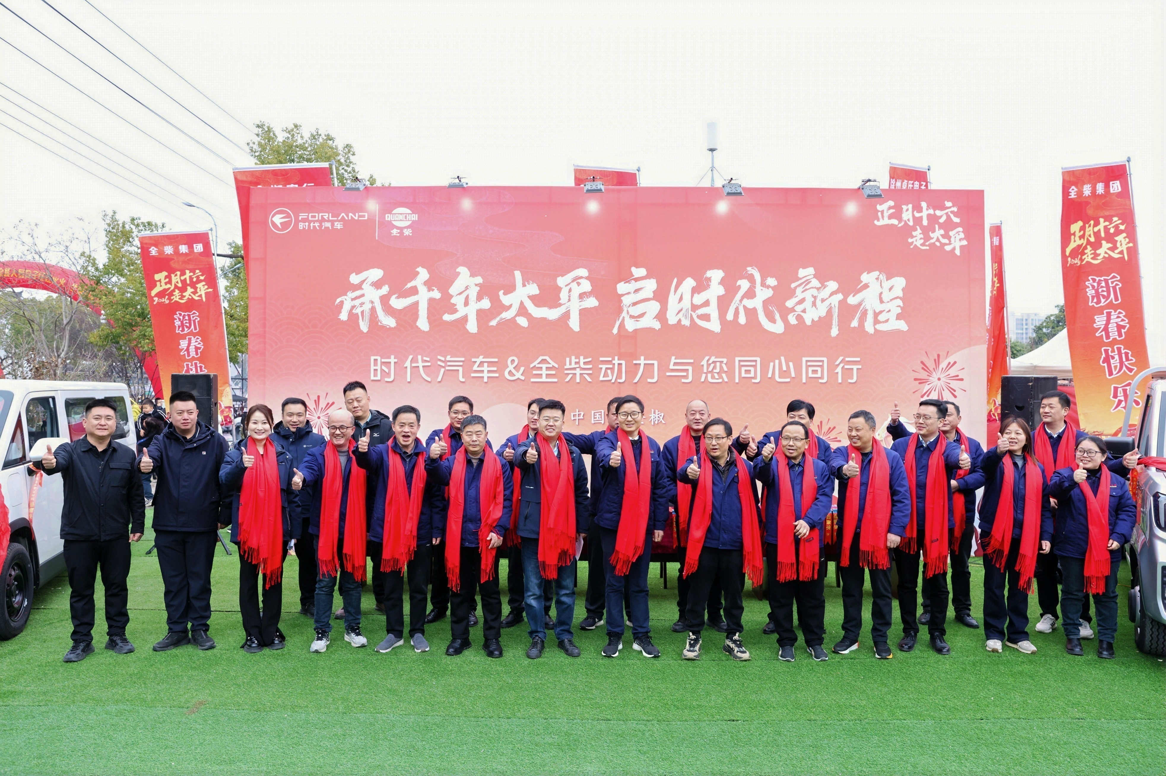 2026年农历正月十六,安徽全椒“走太平”民俗活动启幕。时代汽车与全柴动力强强联合,以“工业品牌+千年民俗”的跨界融合之姿携领航、瑞沃等多款车型亮相,将产品实力与祈福文化相融,为卡友送上平安出行、吉庆绵延的新春祝福,开启马年新征程。全柴动力总经理刘吉文带领全柴集团中层及以上领导团队,时代汽车新能源业务总裁、时代营销公司常务副总经理刘永强、时代汽车品牌总监徐小芸出席现场活动,同时时代汽车与全柴动力7个直播间及16家商用车媒体进行了直播,与直播间约60万卡友共赴太平之约。