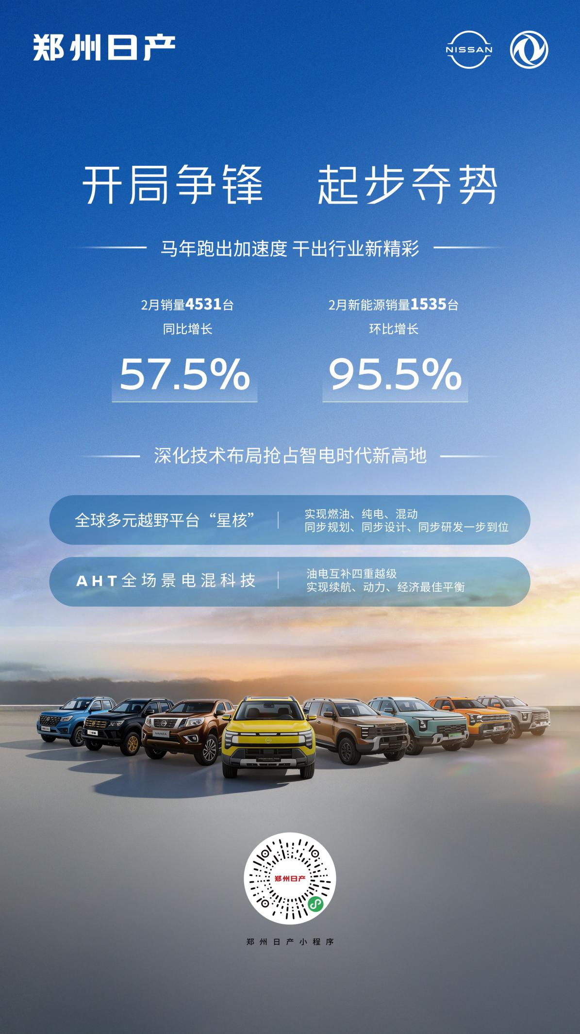2026年新春开局,郑州日产延续高质量增长势头,交出亮眼成绩单。最新销量数据显示,郑州日产2月份销量同比大幅增长57.5%,新能源销量环比增长95.5%,继1月市占率攀升至14.4%后依旧持续发力,以“两连红”的强劲表现,为2026年全年发展筑牢增长根基,彰显出企业在产品、技术、战略层面的硬核实力。