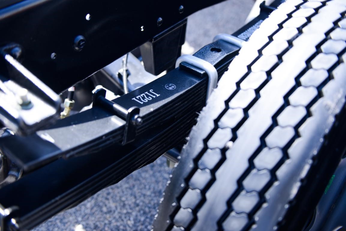 该车采用了气压制动,空气干燥罐使用的是威伯科的产品。储气瓶和电瓶位置依旧位于车架的左侧。纵梁侧面的电气线路预留孔也采用了橡胶包边,防止金属和管路摩擦导致管路破损。